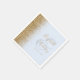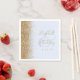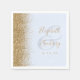 The left-hand edge of these elegant modern wedding napkins features a gold faux glitter design. The customisable text combines gold-coloured handwriting and copperplate fonts over a large ampersand on a pale blue background.