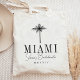 Welcome friends to your bachelorette weekend with these cute personalised tote bags. Perfect for beachy or tropical locales, this design features a black palm tree silhouette illustration with your destination beneath (shown with Miami) in classic serif lettering. Add your name(s) or occasion name beneath in handwritten cursive script, as well as the year.