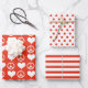 This fun and festive holiday wrapping paper set features three playful patterns: "peace + love", polka dots, and stripes. The red elements can be customised to any colour you like by using the "design tool". See the collection for coordinating items!