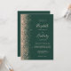 The left-hand edge of this elegant modern wedding invitation features a peach faux glitter design. The customisable text combines pale peach handwriting, copperplate and italic fonts on an emerald green background. The reverse side provides space for wedding details on a solid green background, along with a QR code guests can scan to visit your website and RSVP, which saves the cost of printing and mailing separate RSVP cards.