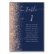 The left-hand edge of this elegant modern wedding table number card features a peach faux glitter border. The word "table" appears in pale peach whimsical handwriting script on a navy blue background. Add the names of your guests who are assigned to each table.