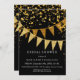 Matching Bridal Shower invitation in honour of the bride. Sleek. Modern. Chic. Understated glam - with glittering pennant banners in two shades of golden glitter with sparkling twinkling falling confetti in various sizes and shade of gold. Sparkly starburst shining stars highlight the sparkle. A very contemporary typography text layout that is anything but traditional. It is simple and short. It says to your guests, "We're throwing a party and it will be the party of a lifetime!" For the elegant but non-traditional bride and groom. COLORS: jet black and gold, golden glitters. Especially suited for fall or winter weddings, New Year's Eve Parties, Birthday parties and Anniversary party announcements.