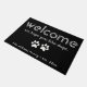 Personalised modern "welcome. we hope you like dogs" door mat in black and white.