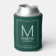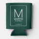 This can cooler features personalised groomsman's monogram and name with title and wedding date in white modern sans serif font style on emerald green background.