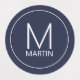Modern minimalist design features personalised monogram and name in white modern sans serif font style on navy blue background.