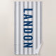 Modern Personalised Name Navy Grey Striped Beach Towel