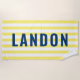Personalised beach towel design features custom text in simple and modern all caps lettering that can be personalised with a first name. Navy blue text contrasts a striped yellow and white background with a stylish pattern of horizontal stripes. Colours and font style can be completely customised.