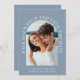 Modern dusty blue destination wedding save the date card featuring your photo in an arch frame and "Pack Your Bags And Save The Date" in elegant white text. Under your photo, add your first names, wedding date and location. On the reverse side, personalise the save the date details in simple typography and input your wedding website URL address to create a scannable QR code for your guests to easily visit your website.