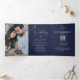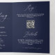 This modern all in one tri fold wedding invitation is absolutely stunning. The front offers a minimalist intro with the names, a calligraphy "and" and the special date, giving your guests a taste of what's inside. The inside left side has a full bleed photo, the middle is the main invitation with bold calligraphy and classic serif typeface. The right side has additional space, a qr code for your wedding website, rsvp information and details information. The back of the invitation has the initials, the website and an additional photo.