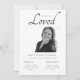 Honour a beautiful life with this elegant Modern Photo Celebration of Life Funeral Service Invitation. Featuring a clean and minimalist design, this template centres around your loved one’s photo, creating a heartfelt tribute that’s simple, timeless, and full of love. The soft typography and layout allow their memory to take centre stage, while customisable text lets you include important service details and a personalised message.