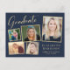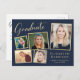 Modern dark blue graduation party invitation postcard featuring a five photo collage of scattered pictures in gold frames, "Graduate" in a stylish gold script, the grad's name in elegant gold typography and their school and class year in simple gold typography. Add your party details on the back.