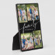 This personalized modern keepsake easel plaque features 4 custom photos with the word “family” in elegant handwritten calligraphy script. The black background can be changed to your own custom color.