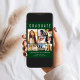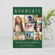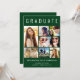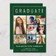 Modern green graduation announcement and party invitation with "GRADUATE" in large white letters, a seven photo collage of the graduate and their name, class year and school in simple white typography. Add your party details on the back.