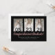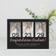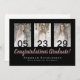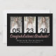 Elegant custom graduation card design featuring rose gold and silver text over a black background, modern script typography with the words "Congratulations Graduate" (in rose gold) with your name and school or university (in silver) and date plus three of your favourite photos on the front of the card. Templates for your message and name(s) are on the back of the card.