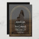 The invitation uses a neutral charcoal grey background, providing a sophisticated backdrop for the golden arch and the couple's photo. The names are displayed in a clean, modern font, adding a touch of elegance to the overall design.