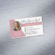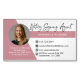 Modern, trendy Notary photo business card features single photo, contact details on a rose gold and white background.