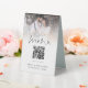 Modern Photo Overlay Qr Code Menu Wedding, with an elegant script for Menu and easy to personalise the rest of the text to your requirements and replace the sample photo with your own. Invite your guests to scan to see your menu. Simply change the sample URL in the template with your own URL of your chosen page of your wedding website and your QR code will be automatically generated to update the sample code in the design, . The same design is on both sides and will update simultaneously.