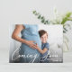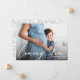 Announce your big news to family and friends with this modern photo card. Design featuring single photo of the expecting mum, coming soon calligraphy script , family name and month the baby is expected to arrive. Card is decorate on the back with floral pattern.
