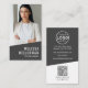 Charcoal Gray Contemporary Photo QR Code Logo Vertical Business Card. This contemporary vertical business card is designed for corporate professionals, small business owners, freelancers, and consultants who appreciate clean, modern design. The front features a rich charcoal gray background with sleek white fonts, showcasing your photo, company logo, name, and title or business name in a bold, polished layout.