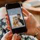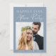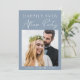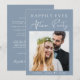 Modern dusty blue elopement or private wedding announcement and reception or celebration party invitation that features your photo, "Happily Ever After Party" in a mix of simple white typography and a chic white script. On the back, personalise your announcement and invitation, input the URL address of your wedding website to create a QR code for guests to scan for all the details and to RSVP online, and add your names in a signature-like script.