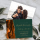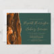 The left-hand edge of this elegant modern wedding invitation features a burnt orange and rust watercolor agate border trimmed with faux gold glitter. The customisable text combines gold-coloured handwriting, copperplate and italic fonts on a dark emerald green background. Easily replace the sample image on the back with your own horizontal photo.