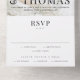 A modern type overlay with large names and a full bleed photo are the features on this all in one wedding invitation with tear off response card.