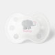 Custom baby pacifier for a baby girl features a cute little grey elephant with pink heart shaped splashes. Design can be personalised with baby's first name or other text.