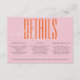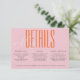 Personalise this modern and colourful, yet simple and unique pink and orange wedding invitation details card featuring large bold "DETAILS" typography on front side with ivory script details and minimalist headline and description wording for whichever 3 details you would like your guests to know. Need more room? Add more details to the back side! Easily add your wording to make it your own! Scroll above to find the matching stationery collection. Custom design requests, product additions to the collection, and template questions are always welcome - click the "message" button, or email direct: contact@figandlilyco.com. Design is lovingly created by Fig and Lily Studios ♥ Sending blessings and thanks for being here with us!