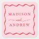 Seal your wedding envelopes and favours in style with custom Modern Pink and Red Wavy Frame stickers! The design features the couple's names in bold red lettering surrounded by a red wavy frame contrasting with a pink background. The retro wedding stickers were designed to coordinate with our Modern Wavy Frame wedding collection.