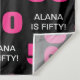 Personalised modern and bold step and repeat tapestry backdrop in pink and black for a woman's 50th birthday party. Add her name for a unique photo prop decorations.