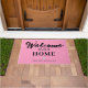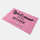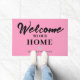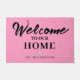 Brighten up your front porch or patio with this Modern Pink Black Welcome Script Family Name Doormat. It is designed with a light pastel pink background and "welcome" is in black bold hand lettered script. The text "to our home" is in bold simple lettering. Family's last name is on lower centre in grey.