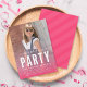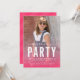 Modern Photo Birthday Party Invitation featuring the words "birthday" in a relax script above a bold "Party" in white against a partly transparent pink with confetti gradient overlay on the front and pink diagonal stripes design on the back side.