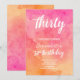 Celebrate in style with this chic and colourful 30th birthday invitation! Featuring a vibrant watercolor background in shades of pink and orange, the modern script font highlights the milestone "Thirty" at the top. This design is perfect for marking a special celebration with its cheerful and inviting vibe. The combination of bold colours and stylish typography makes it a standout choice for any festive occasion.
