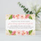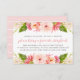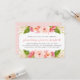 Baby shower enclosure card requests a favourite children's storybook - signed - in lieu of a traditional card. The wording is framed by a pretty watercolor floral arrangement with green foliage and pastel pink, blush, and peach spring dahlia and rose flowers. A pattern of white horizontal stripes dress up the back of the pale ballet pink card.