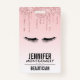 Name badge with a modern, trendy design. For those wish to convey an air of class and elegance. Designed with a background which has an image of sparkling, pink glitter drips. The rest of the background is a delicate pastel pink colour gradient. An illustration of a pair of black eyelashes complete the design.