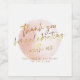 Design features a modern calligraphy script Thank You For Celebrating With Us over a pink and gold splattered watercolor shape. Easily customise names and special event date. An ideal compliment to your modern wedding, bridal party favour gifts, and more.