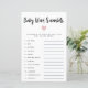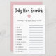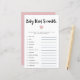 Modern and simple girl baby shower baby word scramble card featuring a pink heart. The list of words on this card are all related to babies and they are scrambled. The guests are going to compete who can unscramble all of them first! ANSWER KEY: 1. car seat 2. milk 3. playpen 4. pacifier 5. diaper 6. rocking chair 7. nursery 8. baby monitor 9. swaddle 10. formula 11. rubber ducky 12. stroller.