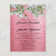 A contemporary pink wedding postcard invite featuring a charming bouquet of white roses and rosebuds hanging down from above. In the background is a shiny, slightly industrial-looking metallic pink to give this invitation a very modern, slightly edgy look with a traditional floral touch.