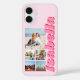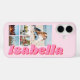 Create your own personalised photo collage iPhone case featuring 5 of your favourite pictures in simple grid design alongside custom monogram name in modern pink typography.
