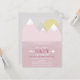 A modern baby shower invitation featuring an illustration of snow capped pink mountains and a yellow sun.