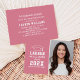 Announce your high school or college graduate in style with this graduation announcement and party invitation. Two-sided card features a senior portrait of the graduate with grad cap and simple and modern white typography design. The pink background can be changed to a different colour with the "Customise It" feature, then Edit / Background to select another colour.