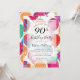 Invite your 90th birthday party guests in style with this modern flat card invitation featuring a background of balloons with colourful fractal patterns in pink, red, purple and gold. Your party details to personalise are in black typography on a white opaque overlay. The back of the card has a pattern of colourful balloons on white. Designed by ©Tim Coffey and Susan Coffey.