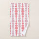 This towel set has a mid-century modern design of pink and lavender rounded rectangles in increasing and decreasing size running vertically on a field of white.