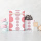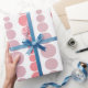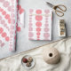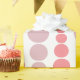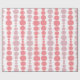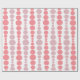 This wrapping paper has a mid-century modern design of pink and lavender rounded rectangles in increasing and decreasing size running vertically on a field of white.