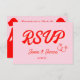 Modern pink and red lesbian wedding rsvp card with double rings and kissing woman.