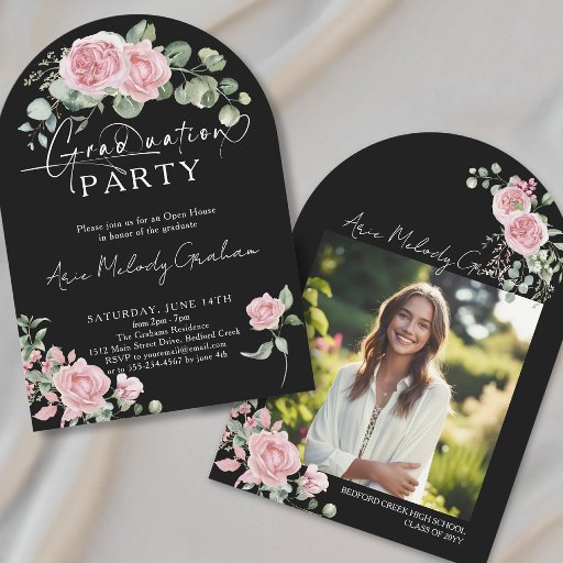 Modern pink roses script photo graduation invitation