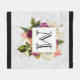 A fleece blanket with a pretty watercolor design. A floral arrangement of many different varieties of flowers in red, pink and white colours, and lots of leafy green foliage. A frame layered over top with a faux-gold-foil border. Classy and elegant design. An off-white marble pattern background. Personalise with a single monogram letter.