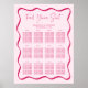 Keep your seating plan clear with this Modern Pink Wavy Frame Wedding Seating Chart Poster. A light pink background accented by a bold pink wavy border frames 12 tables, with guest names neatly listed beneath each one. At the top, “Find Your Seat” is written in handwritten pink script, with your names and wedding date displayed below. Available as a professional print or instant download.