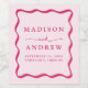 Add a personalised touch to your wedding reception, engagement party, or rehearsal dinner with custom Modern Pink Wavy Frame wine labels. The design displays your names, wedding date, and wedding location in bold pink lettering surrounded by a pink wavy border contrasting with a light pink background. The retro wine labels coordinate with our Modern Wavy Frame wedding collection.