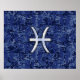A chrome like Pisces zodiac sign on a navy blue digital camouflage design print background. A modern urban racy design for a great custom birthday gift idea.